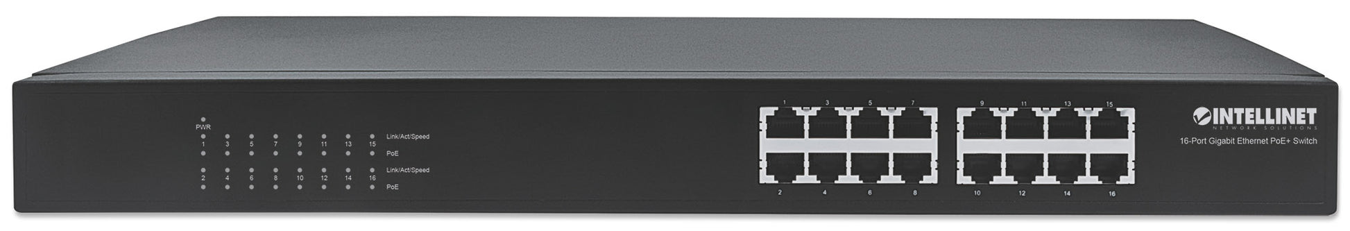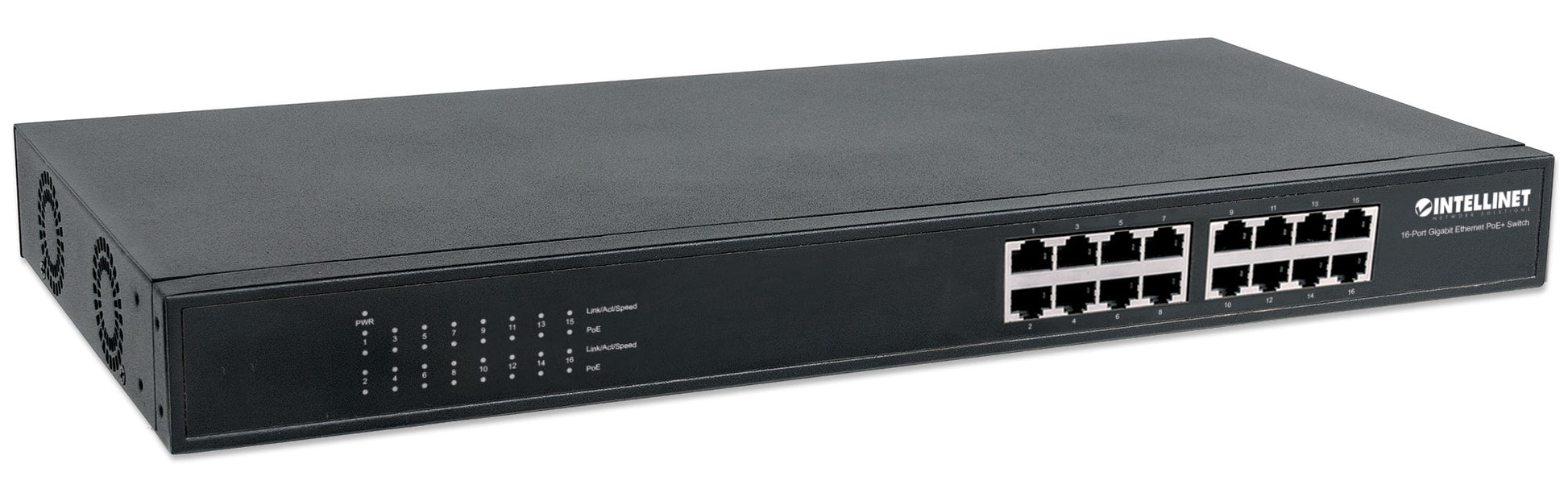 The Intellinet Network Solutions Gigabit Ethernet Power over Ethernet Network Switch (560993) is designed to pass both data and electrical power to a number of PoE-compatible devices via standard Cat5e or Cat6 network cables. Equipped with 16 Gigabit Ethernet ports, this switch can power wireless LAN access points and bridges, VoIP phones, IP video cameras and more while delivering network speeds of up to 1,000 Mbps.