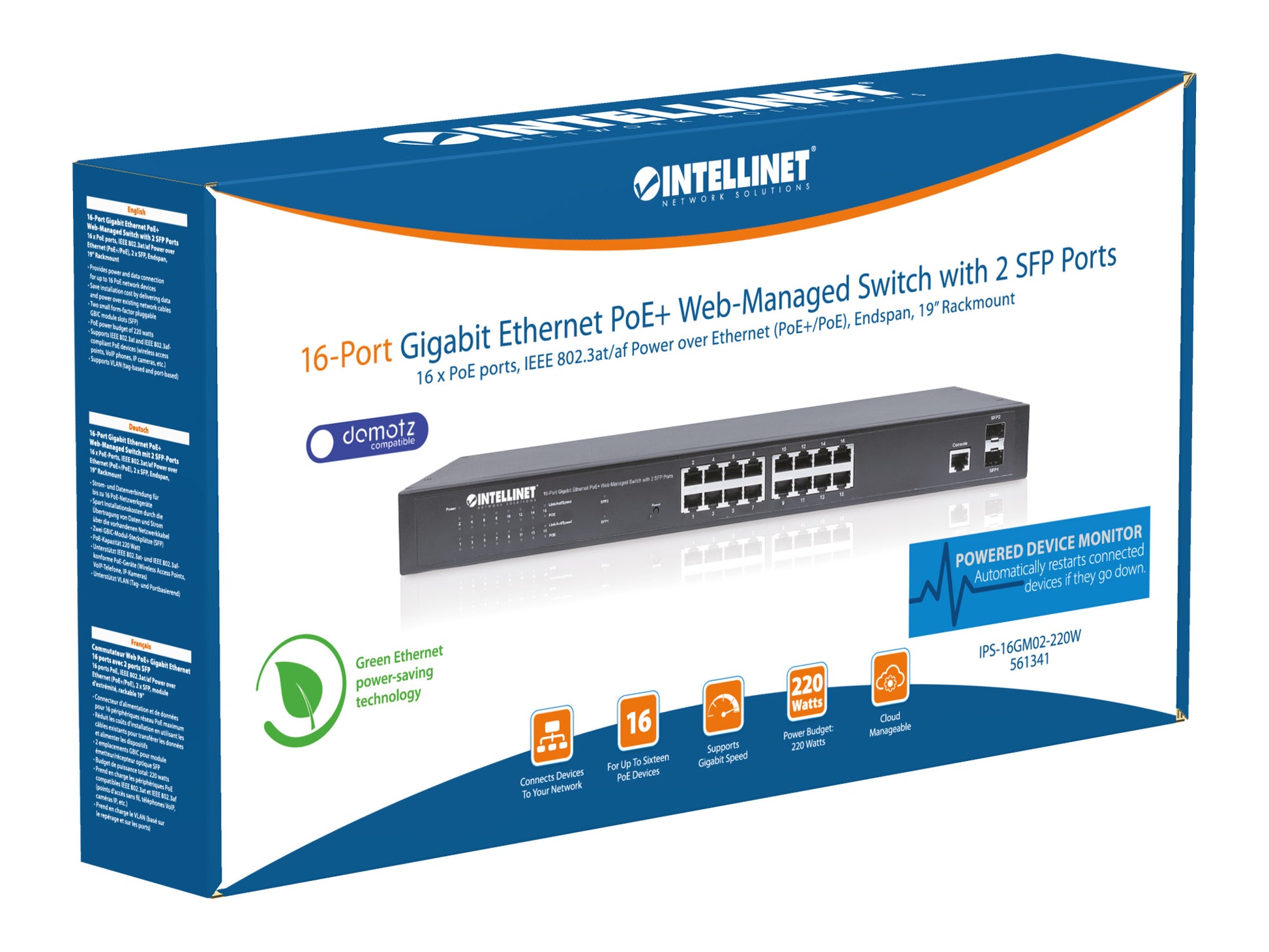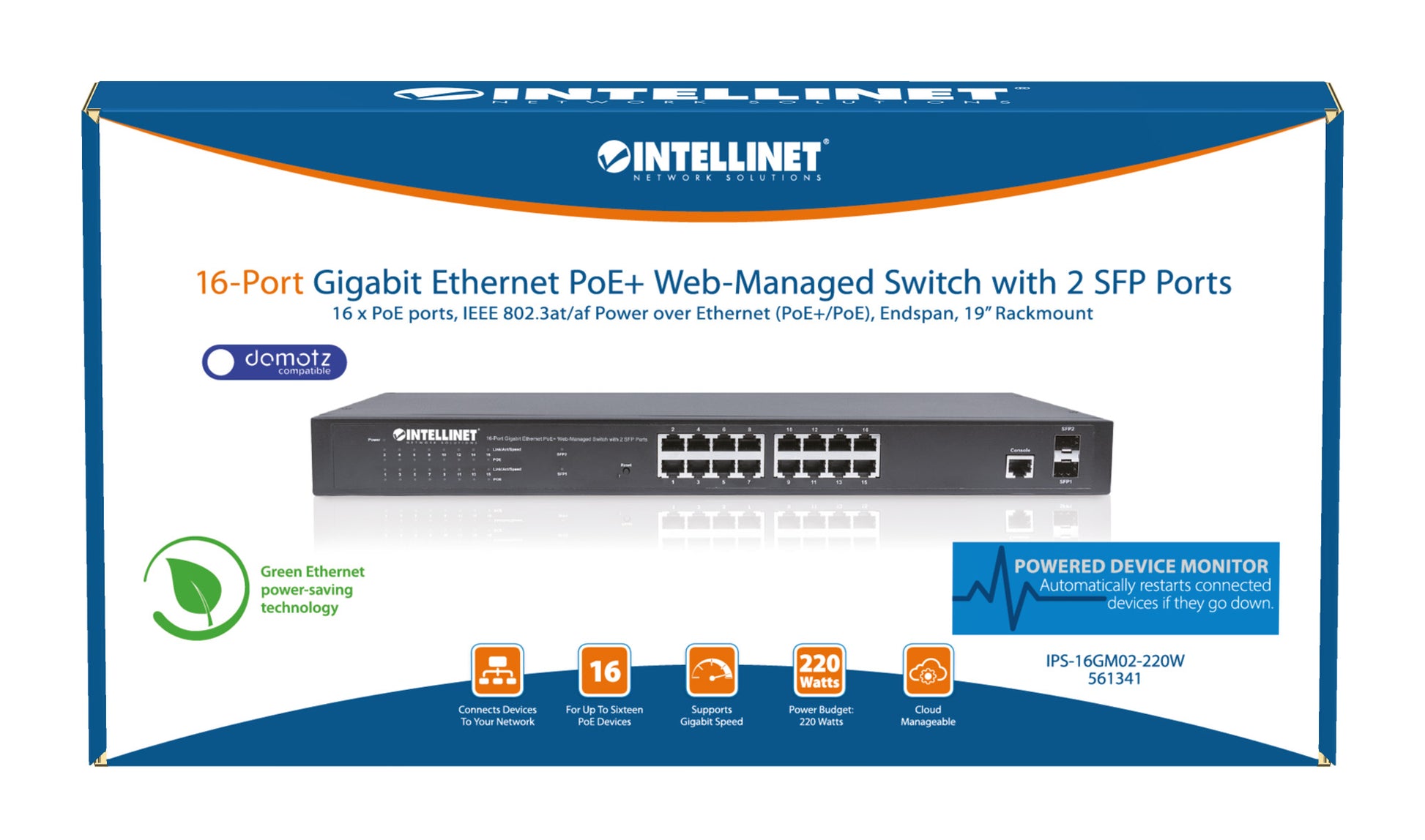 The Intellinet Network Solutions 16-Port Gigabit Ethernet PoE+ Web-Managed Switch with 2 SFP Ports (561341) is designed to pass both data and electrical power to a number of PoE-compatible devices via standard Cat5e or Cat6 network cables. Equipped with sixteen Gigabit Ethernet ports, all of which support 802.3at/af Power over Ethernet (PoE/PoE+), this switch can power Wireless LAN access points and bridges, VoIP (Voice over Internet Protocol) telephones, IP surveillance cameras and more while delivering network speeds of up to 1,000 Mbps.