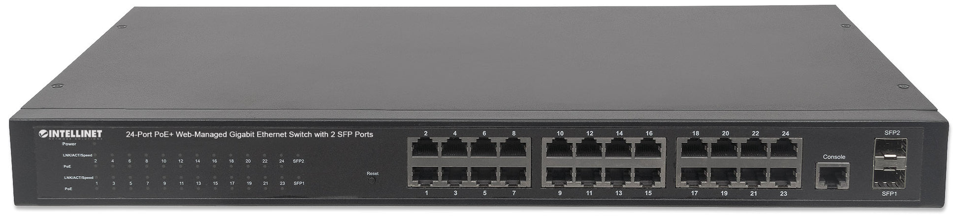 The Intellinet Network Solutions 24-Port Gigabit Ethernet PoE+ Web-Managed Switch with 2 SFP Ports (560559) is designed to pass both data and electrical power to a number of PoE-compatible devices via standard Cat5e or Cat6 network cables. Equipped with 24 Gigabit Ethernet ports, all of which support 802.3at/af Power over Ethernet (PoE/PoE+), this switch can power Wireless LAN access points and bridges, VoIP (Voice over Internet Protocol) telephones, IP surveillance cameras and more while delivering network speeds of up to 1000 Mbps.