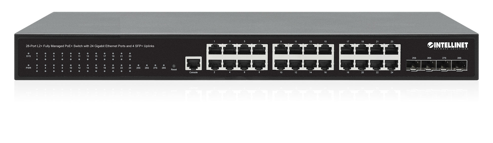 - 28-Port L2+ Fully Managed PoE+ Switch with 24 Gigabit Ethernet Ports and 4 SFP+ Uplinks