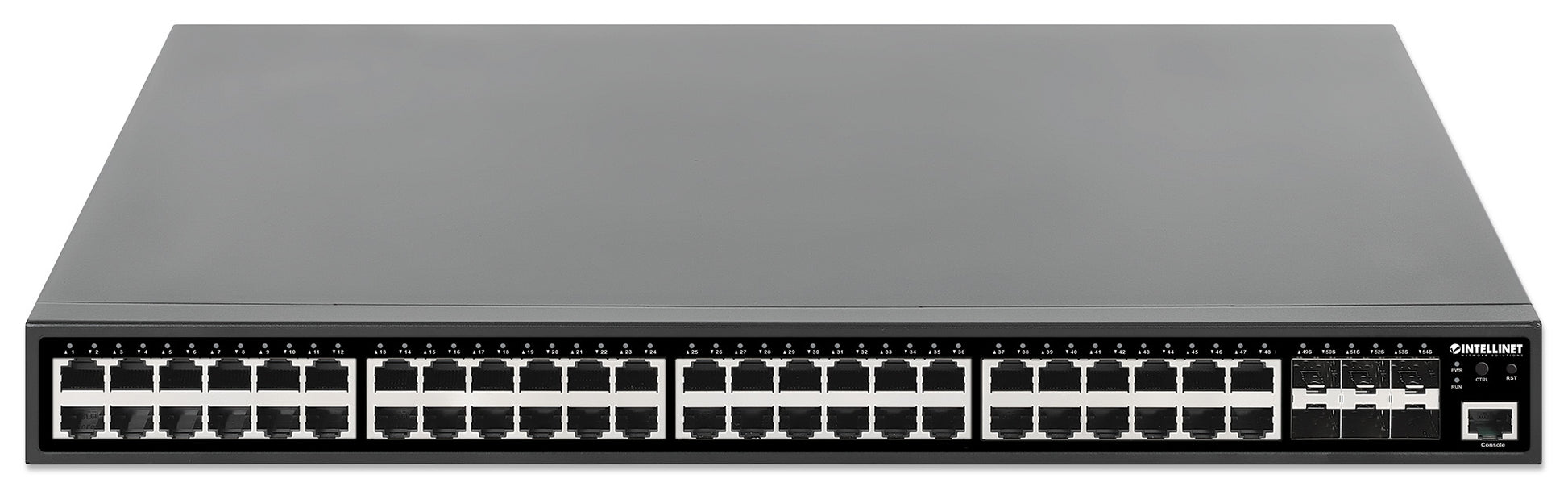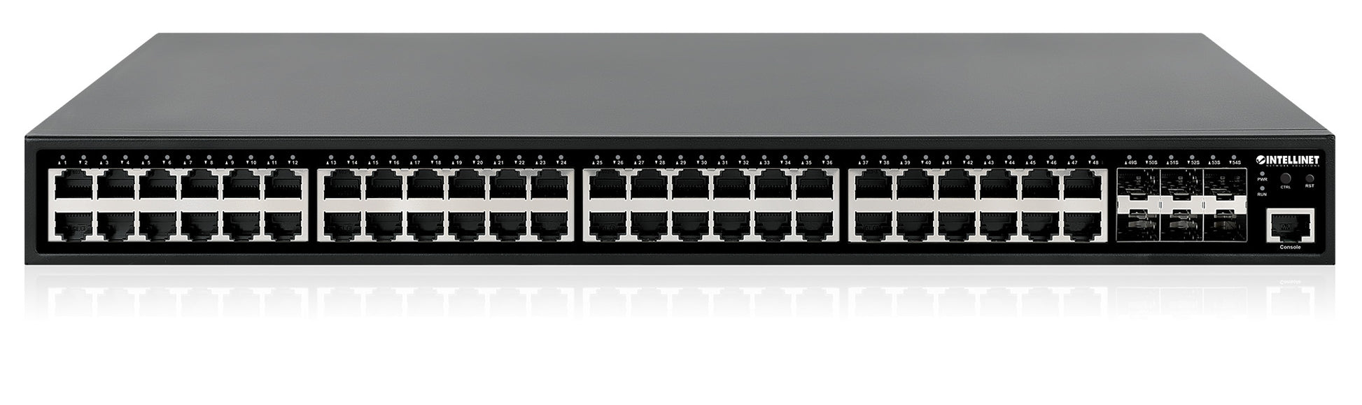 This 54-Port L2+ Fully Managed PoE+ Switch with 48 Gigabit Ports and 6 SFP+ Uplinks is one of the flagship switches from Intellinet Network Solutions. With six 10G SFP/SFP+ module slots, a PoE power budget of 450 watts, 48 Gigabit Ethernet ports and several features like VLAN, QoS, SNMP and IGMP, it is a feature-rich installer’s choice for medium-sized businesses.